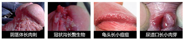 尖锐湿疣病初为淡红或污红色粟状大小赘生物及米粒状小颗粒,形态如丘疹状、乳头状、菜花状、鸡冠状,性质细嫩、无痛痒感,渐渐长大或增多。赘生物基底稍宽或有带,表面有颗粒,在颗粒间常集中有脓液,散发腐臭气味,搔抓后可继发化脓。男性好发于阴茎冠状沟、龟头、包皮、系带、尿道口,少数见于阴茎体部。